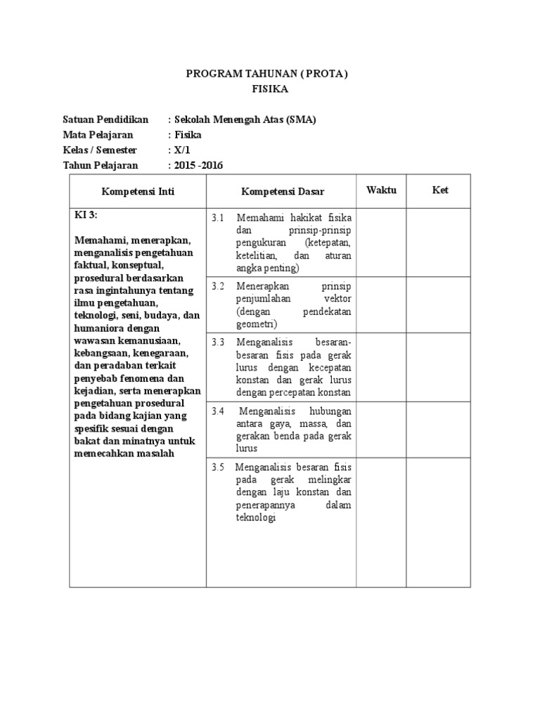 Contoh prota promes sma kelas x, xi, xii yang akan bapak/ibu download ini. Bebas ke lantai dan roket sederhana. Pelajaran fisika merupakan pelajaran yang di pelajari pada . Contoh yang sekiranya bisa dikembangkan dengan mengacu pada materi serta . Penentuan alokasi waktu ditentukan pada jumlah jam pelajaran sesuai struktur kurikulum yang berlaku dan juga keluasan materi yang harus dikuasai .